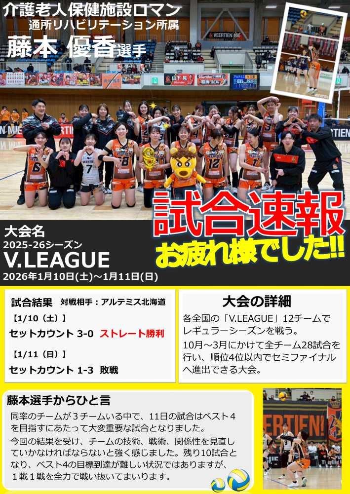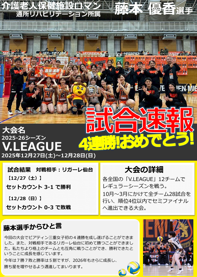 | 通所リハビリテーション4月のTOPICS | バレーボール 藤本CW試合結果 | バレーボール 藤本CW試合結果 (VS倉敷アブレイズVS広島オイラーズ) |